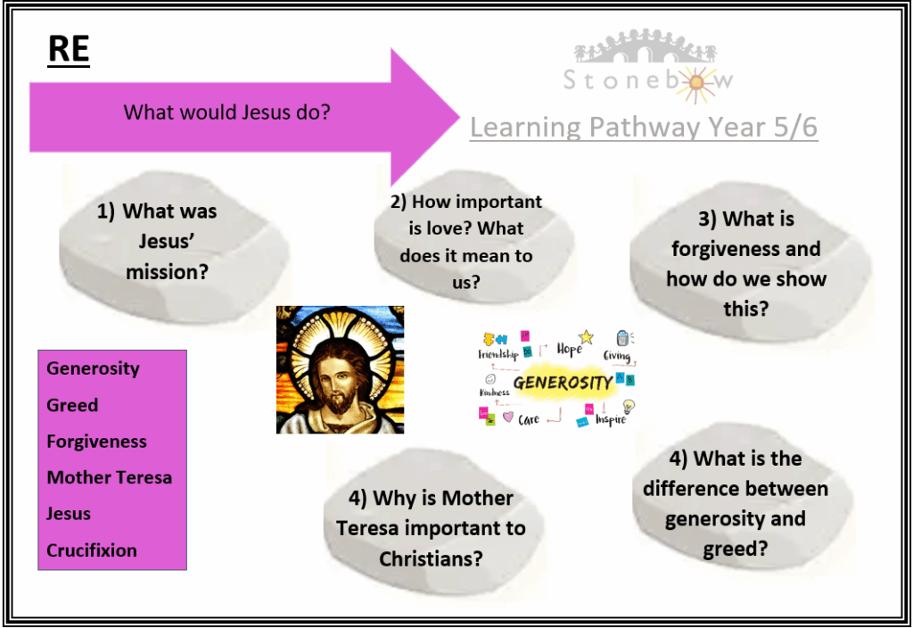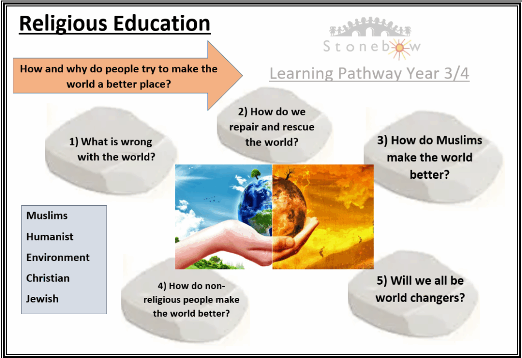 We allocate at least 30 minutes per week for RE as part of our broad and balanced curriculum. We ensure that a range of activities that have transferable knowledge value are undertaken. The opportunity for ‘hands on’ learning; thoughtful discussion and extended written work are part and parcel of the knowledge-based philosophy of learning we have here at Stonebow Primary School.